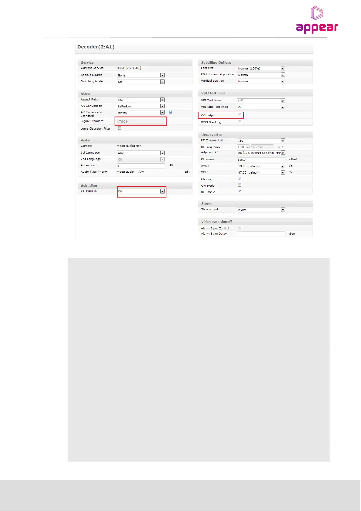 The MPEG-2/4 SD/HD decoder currently supports CEA-608 encoded closed