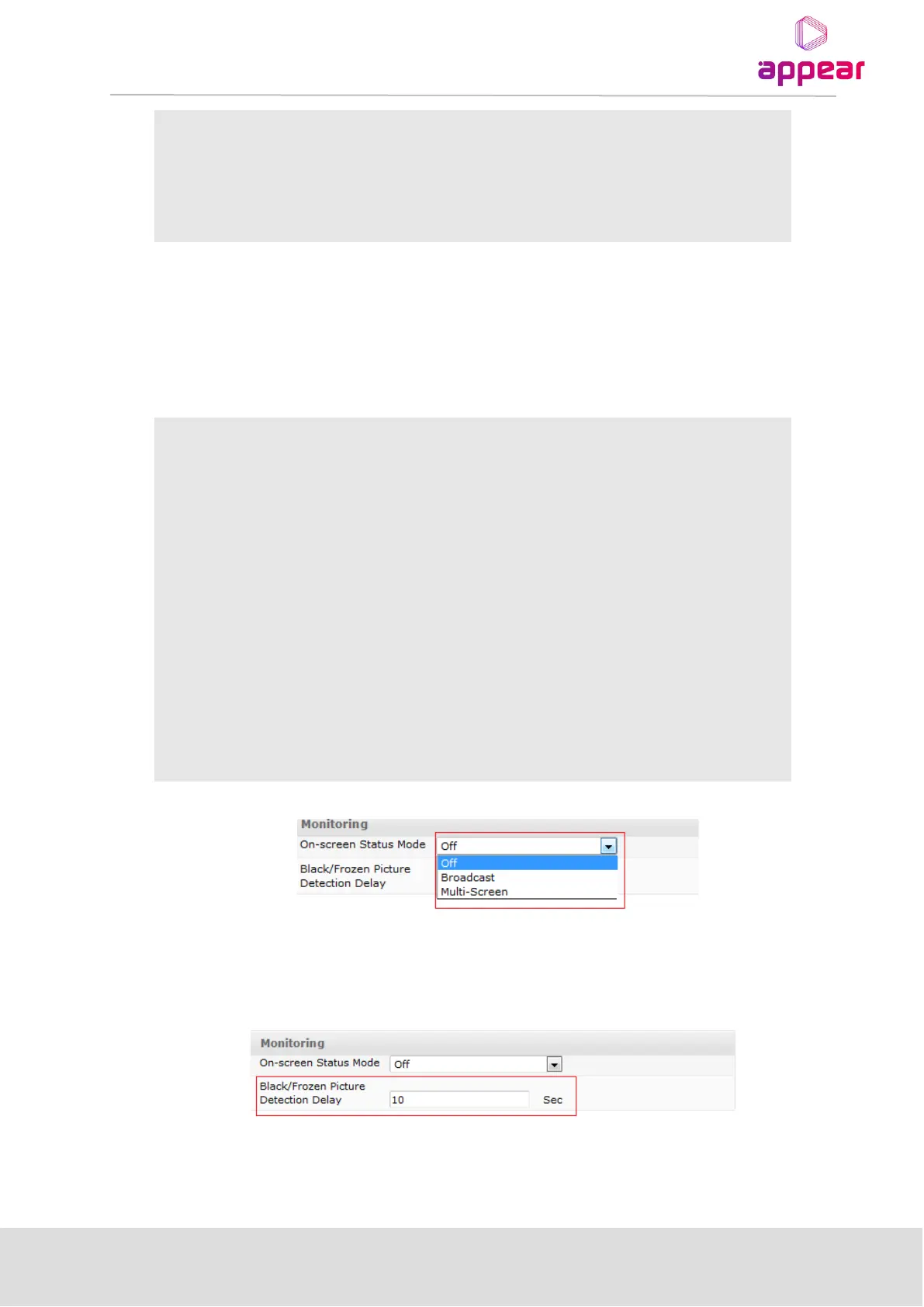 The Black/Frozen Picture Detection Delay allows the user to customise the delay before these alarms are raised