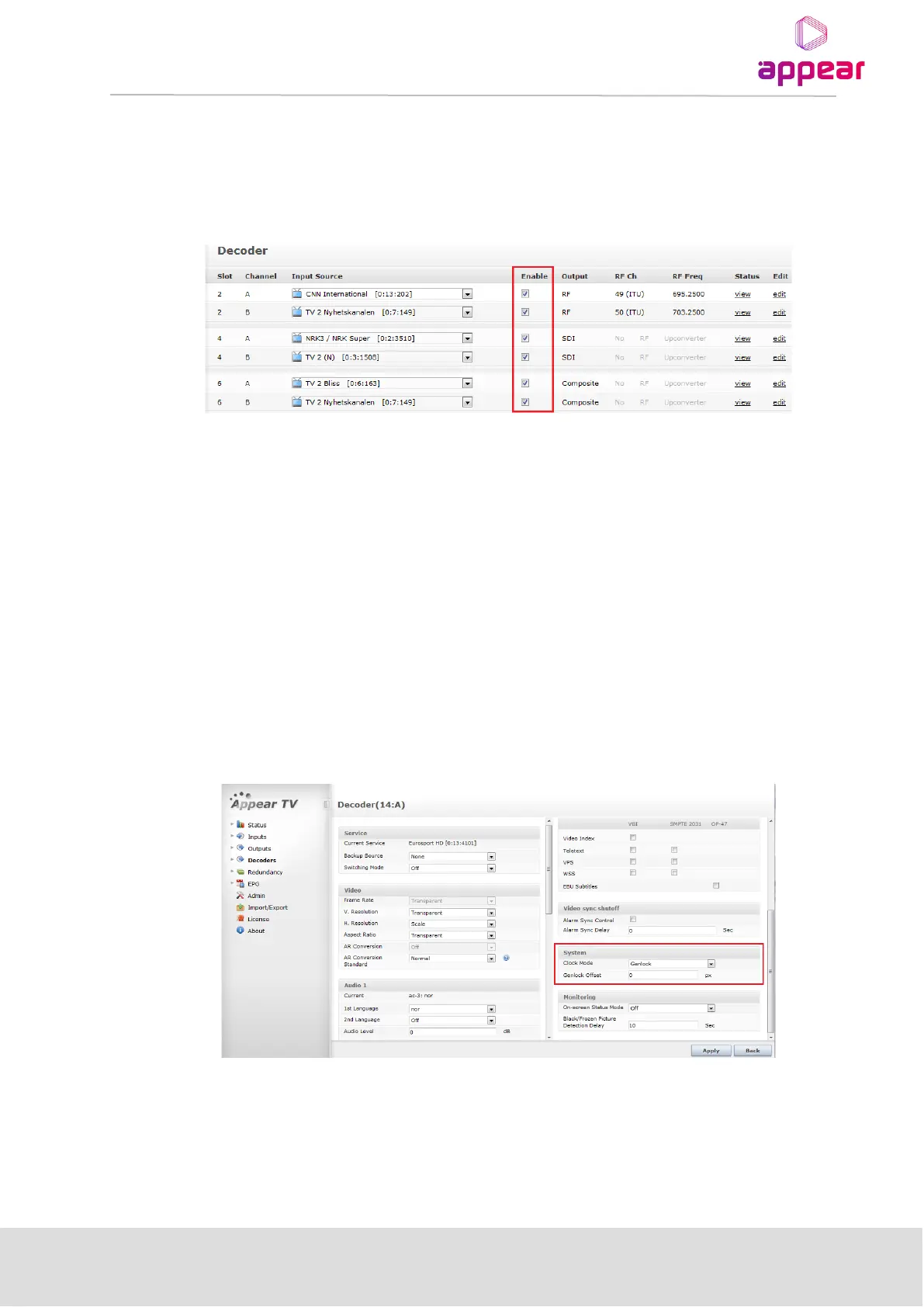 Genlock functionality is enabled in GUI through the "Clock Mode" setting. If the MPEG-2/4 Decoder is Genlock