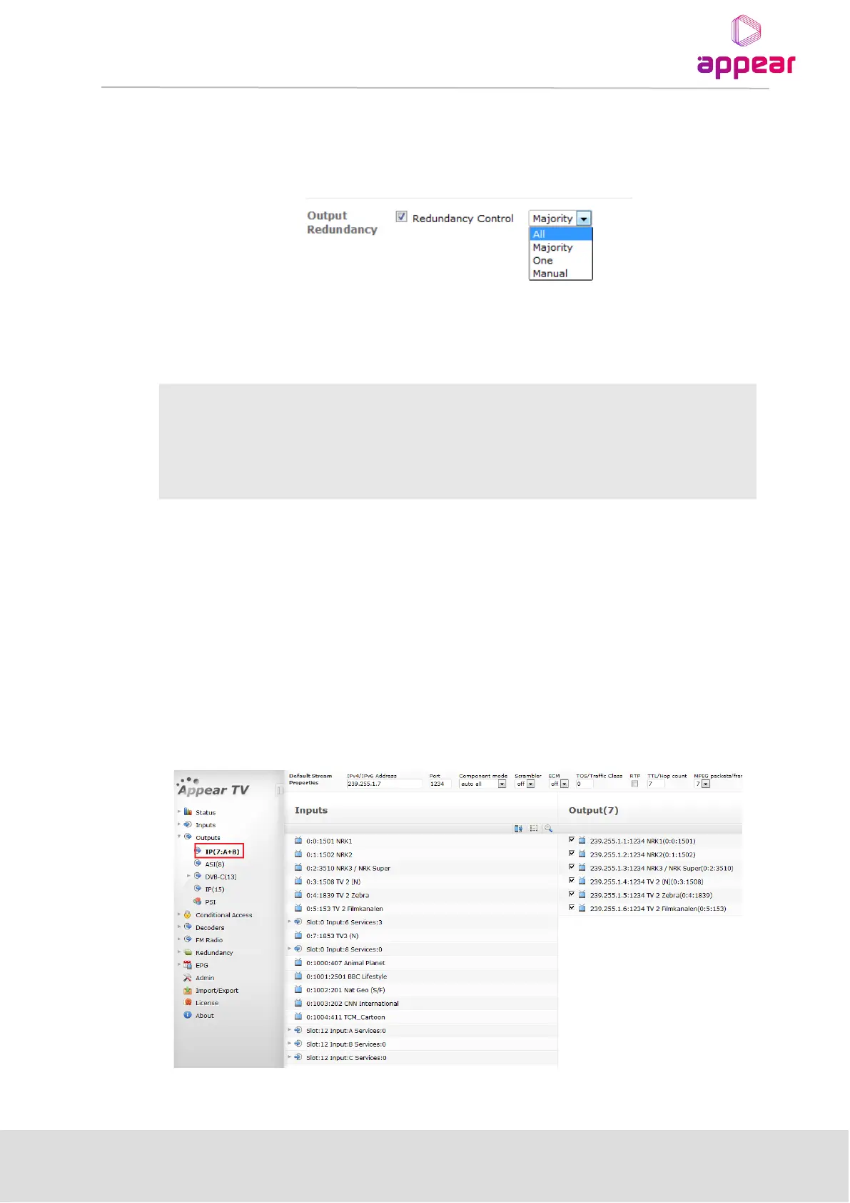The Output Redundancy fields are to be used in a system configuration where two IP modules or services are