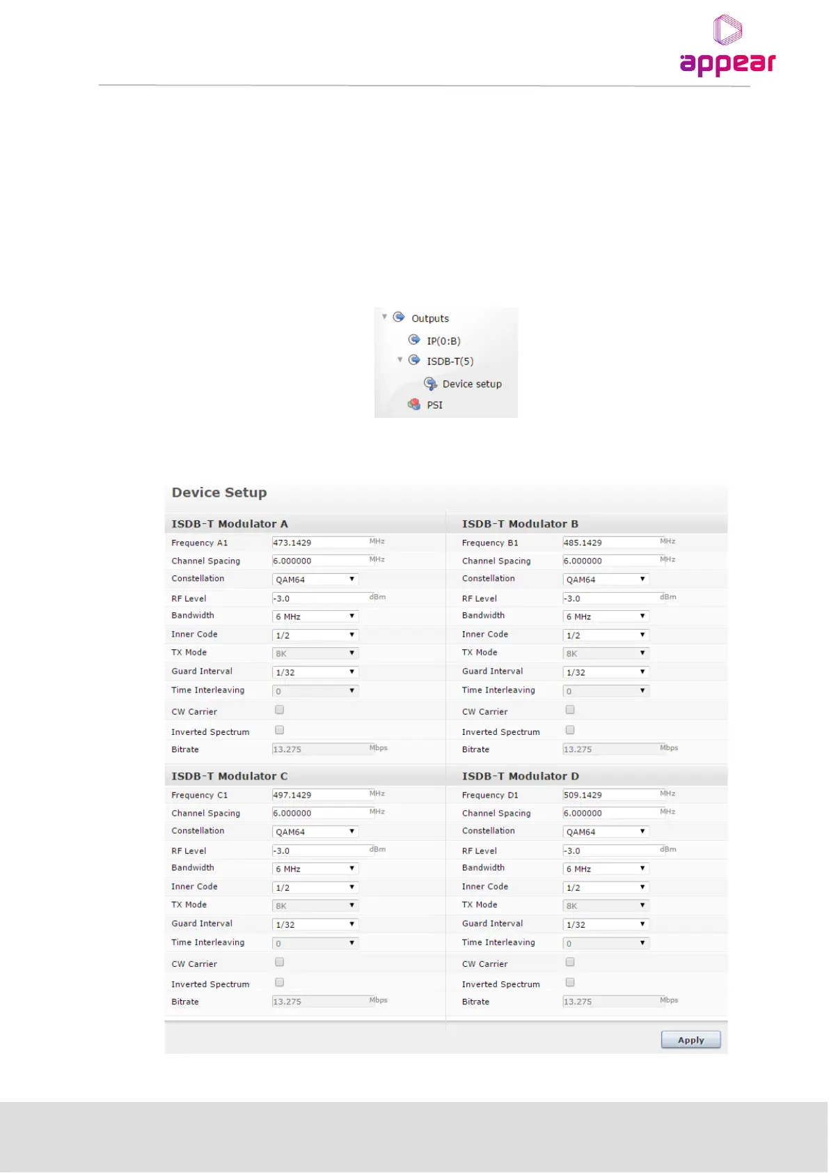 When Device Setup is selected, both modulators can be configured from the resulting dialog: