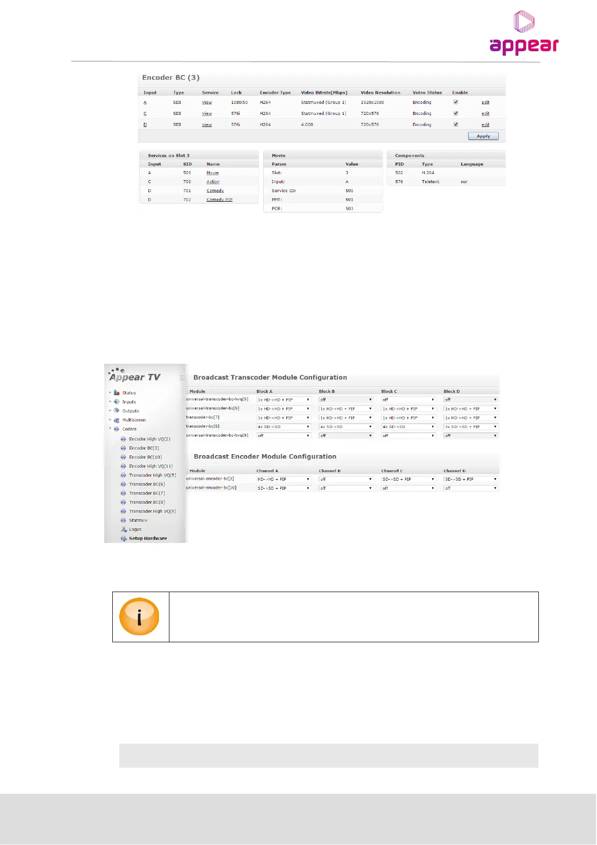 Depending on the mode of the hardware, it will be possible to configure the internal transcoder blocks (A, B, C