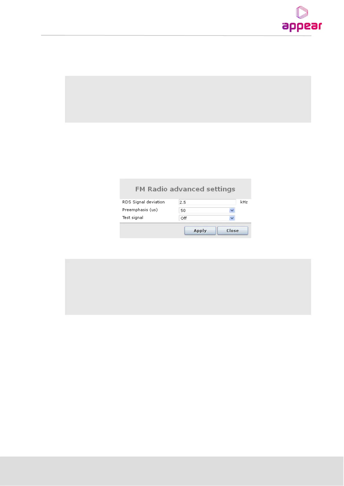 Signal deviation (kHz) – the default value is 2.5 kHz, valid input range is 0.1 – 9