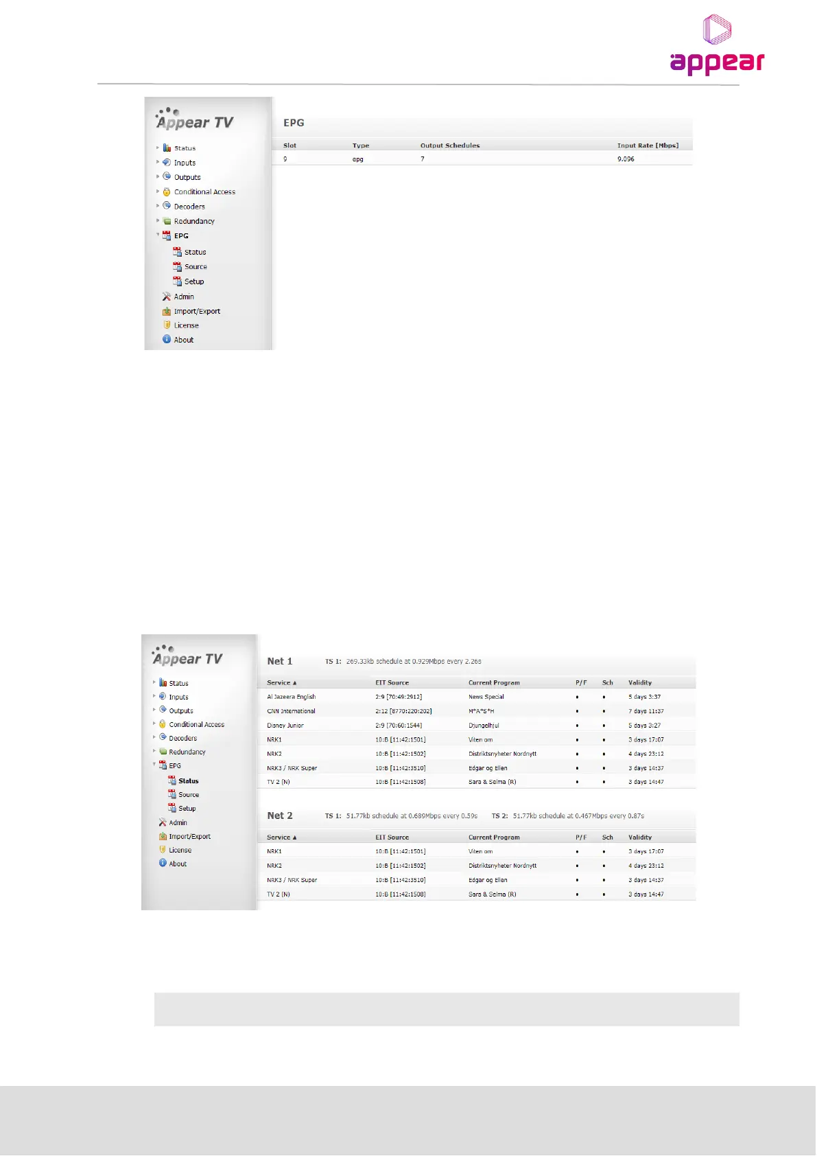 The EPG Status node (Figure 11.4) displays all outgoing transport streams carrying EPG data. The data is