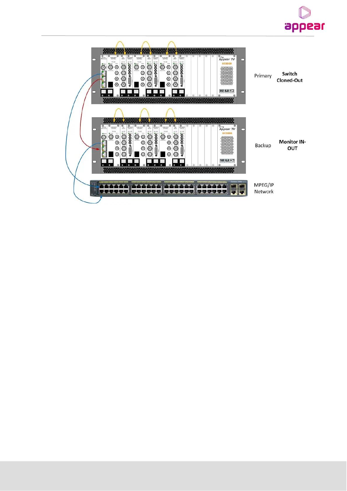 The primary units Switch+IP module will be configured in Cloned IP Output mode and have the identical MPEG