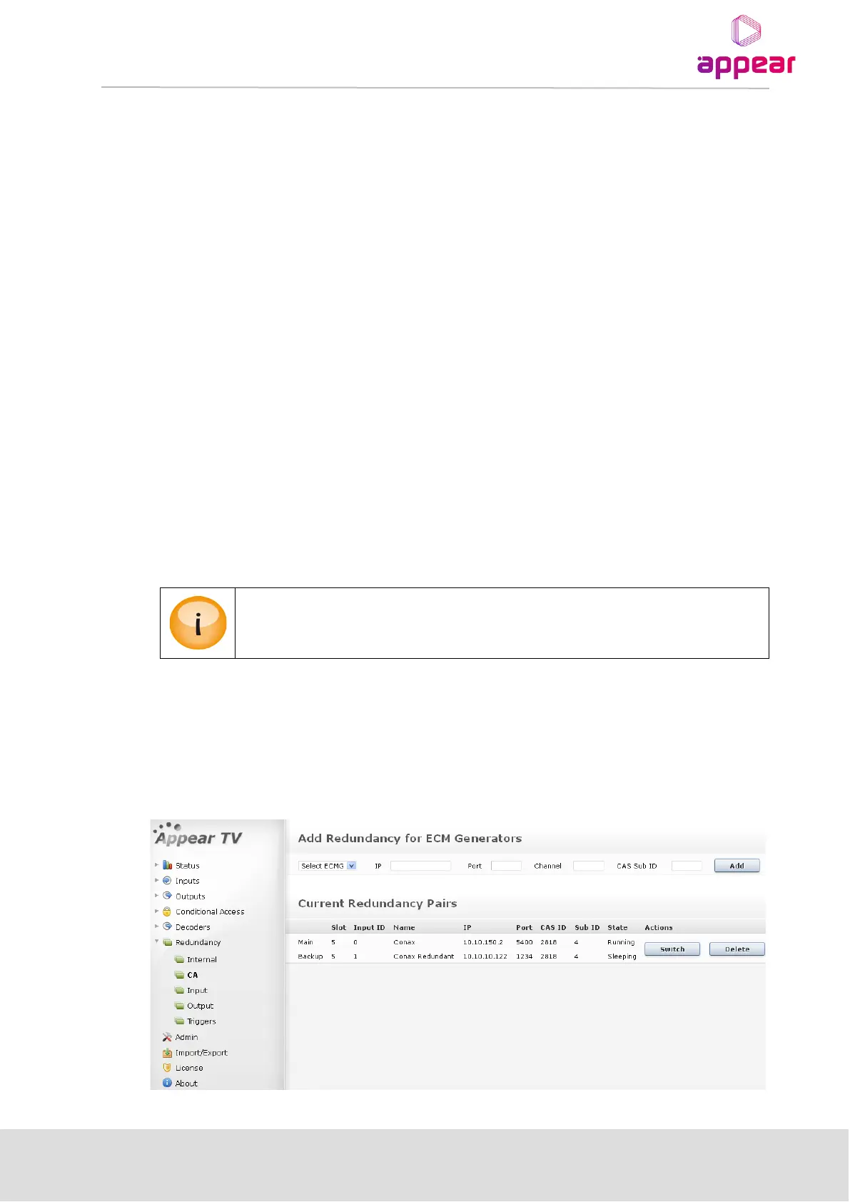 The unit supports CA redundancy, in other words, ECMG and EMMG redundancy. The difference between