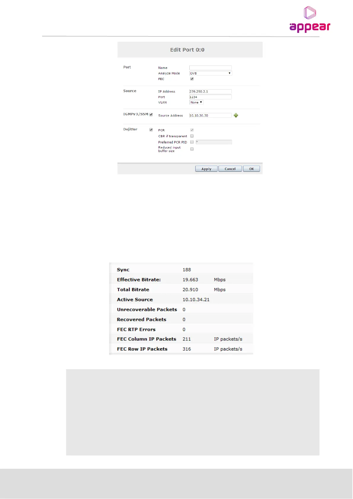 For IP input modules with FEC, the input window has an additional checkbox for each stream, allowing you to