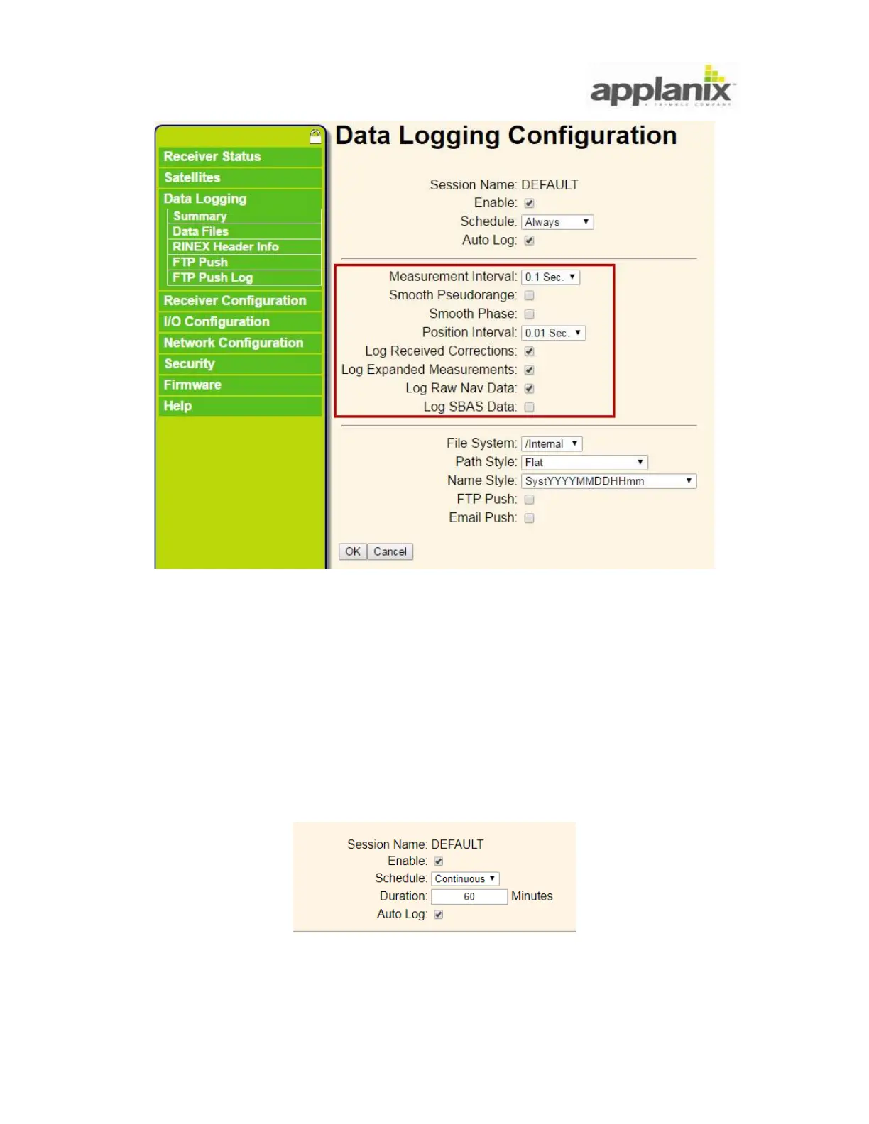 Continuous: data is logged in many files of size Duration