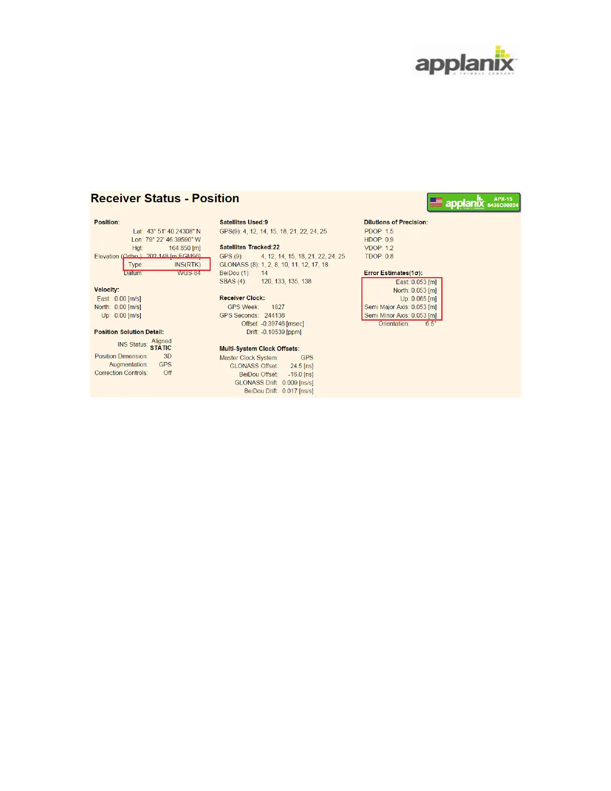 example that displays RTK mode and corresponding centimetres level error estimates.