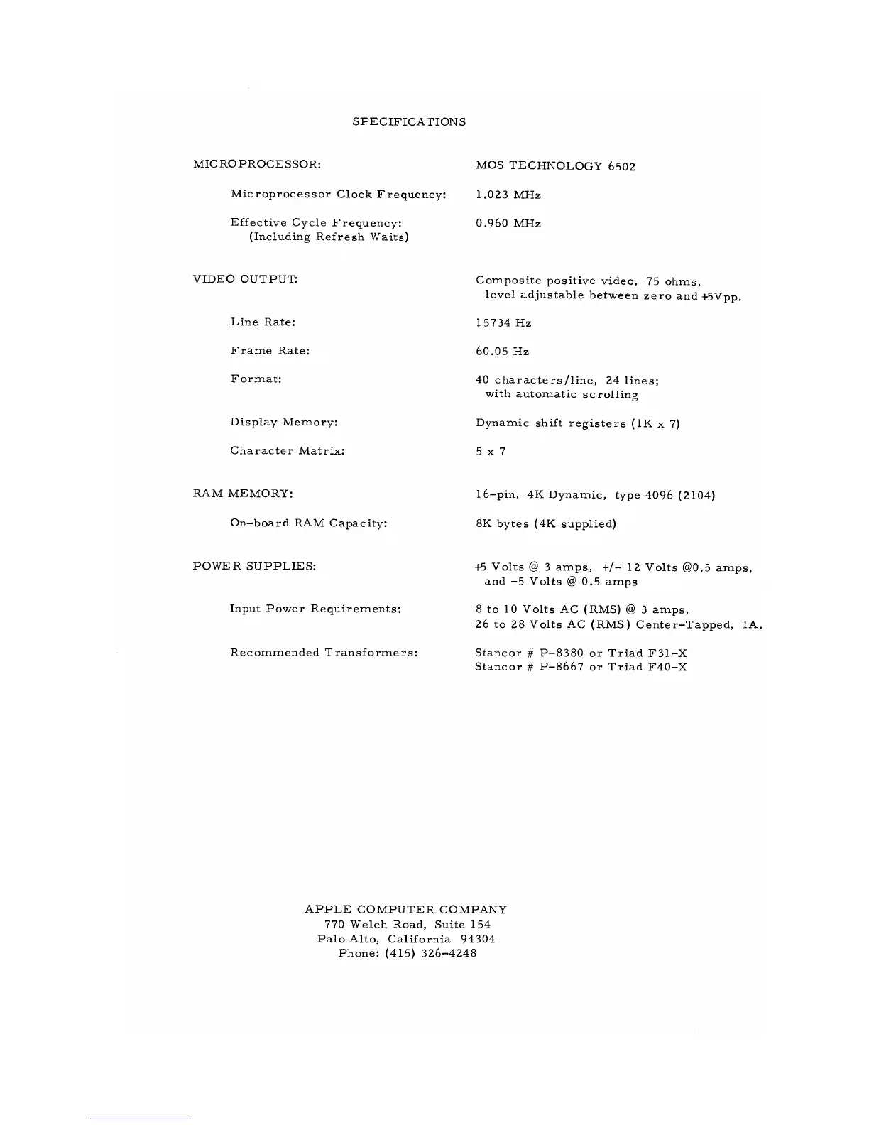 Apple 1 - Specifications; Microprocessor; Video Output; RAM Memory