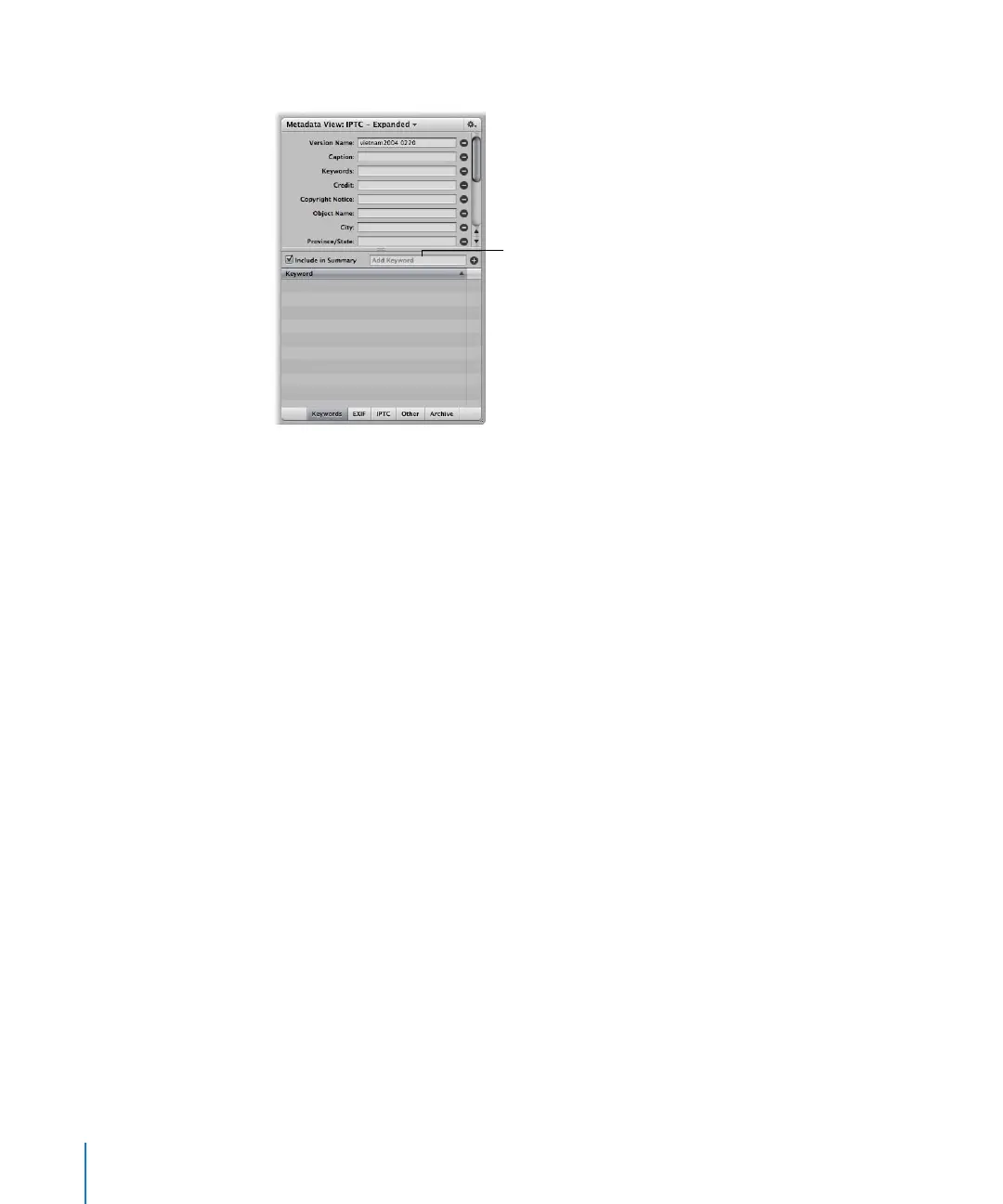 You can view the keywords applied to an image version in several areas: