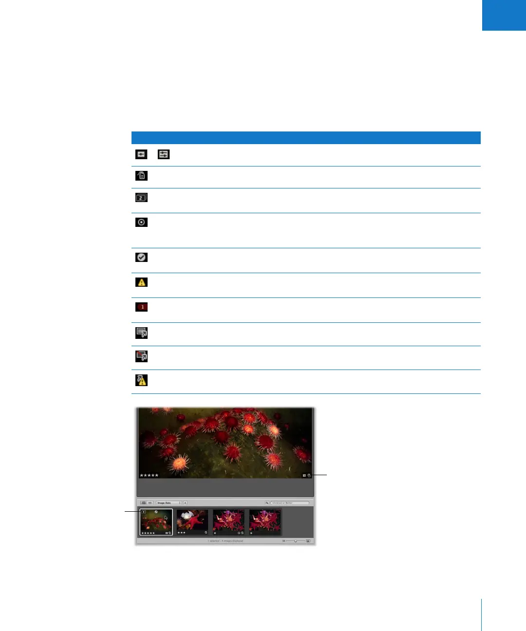 The following table shows badges that appear on images in Aperture.