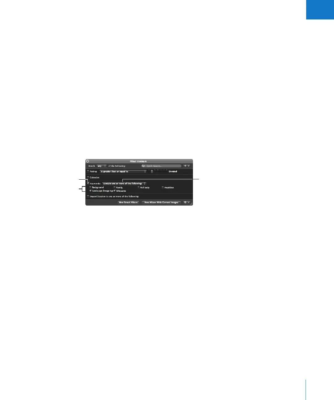 keywords an image must have to qualify as a match. For example, you can choose to
