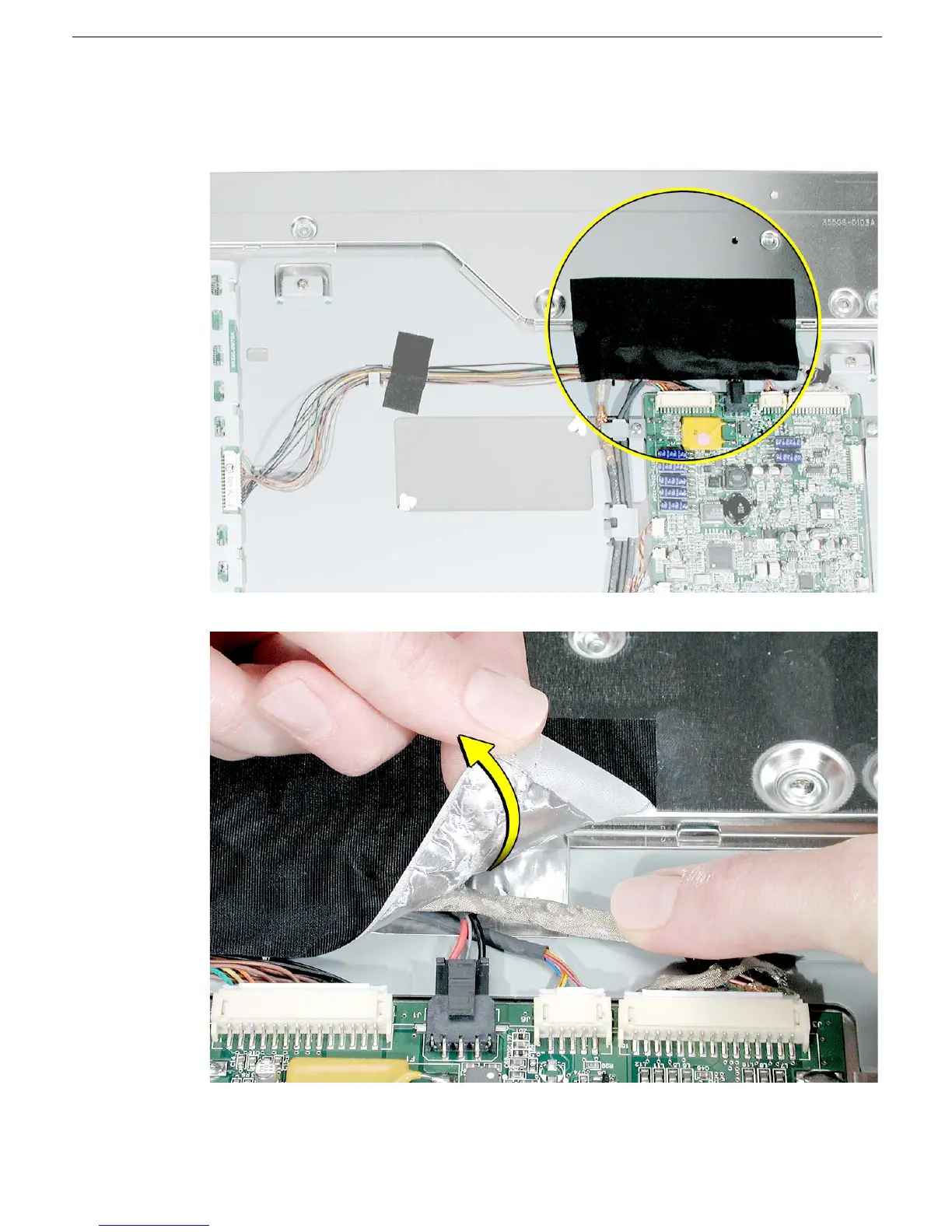 3. Carefully remove the large strip of black acetate tape covering the cables. Hold down