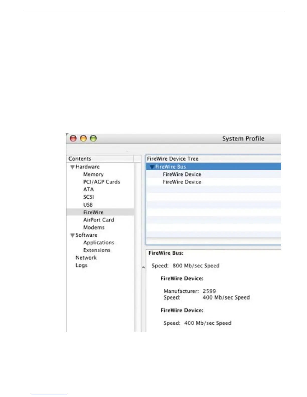 4. If the FireWire device is recognized by System Profiler, the customer’s FireWire device