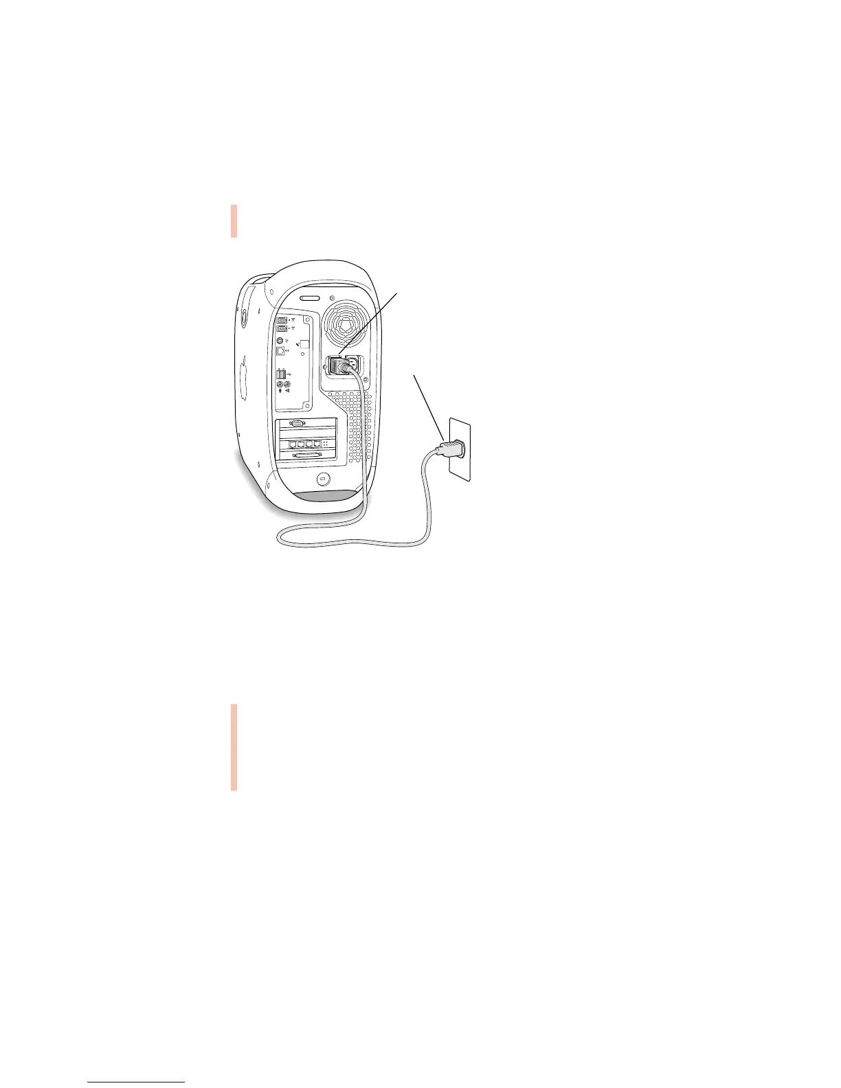 2 Plug one end of the computer’s power cord into the recessed power socket marked with the