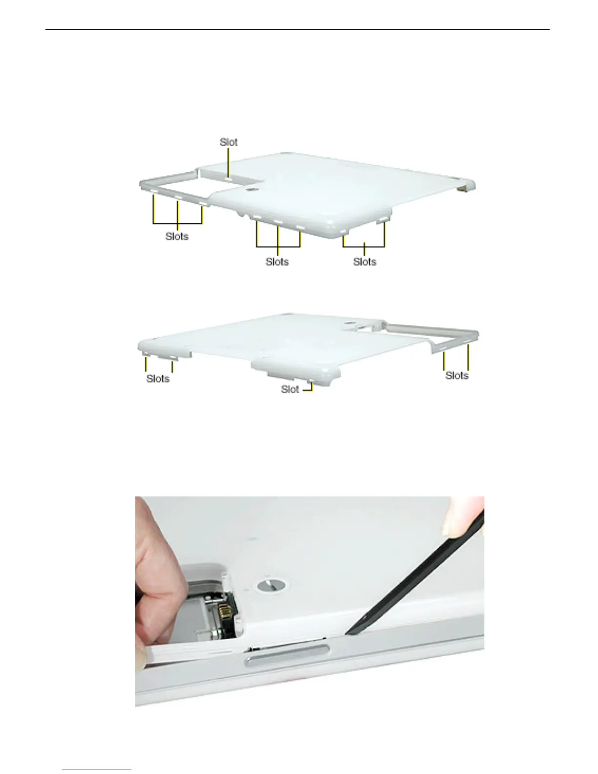 7. Note the locations of the slots on the bottom case pictured below. The computer frame
