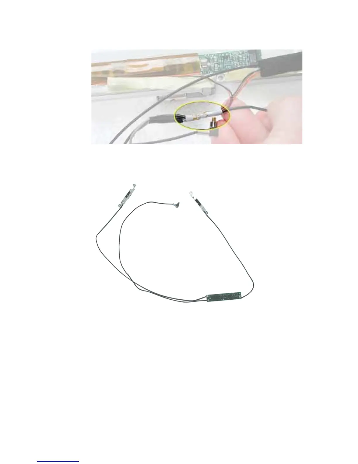 11. Unwrap the tape that secures the AirPort Card antenna to the cable bundle.