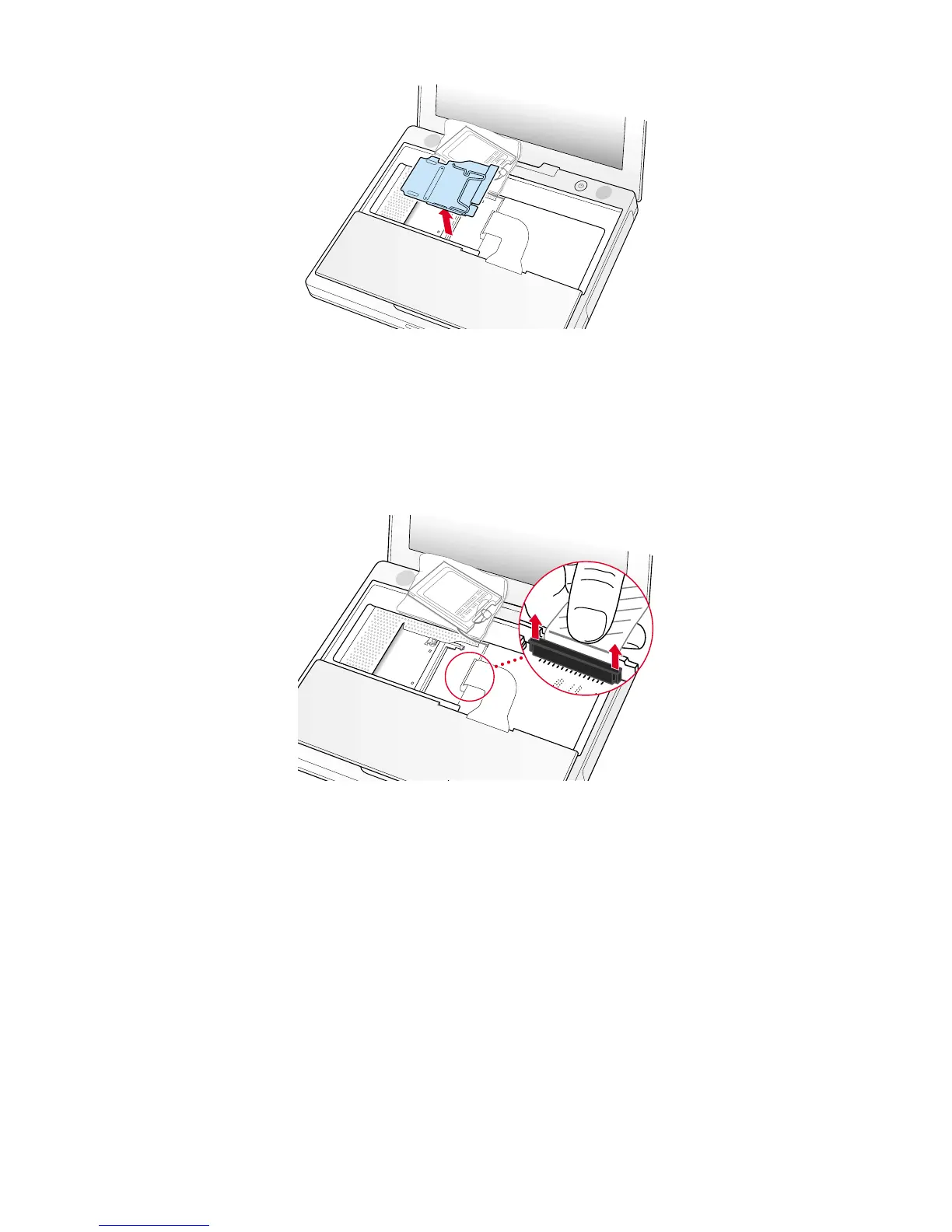 5. Lift the RAM shield out of the computer. Carefully pulling up on the wire holder may help to remove the shield (Figure 8).