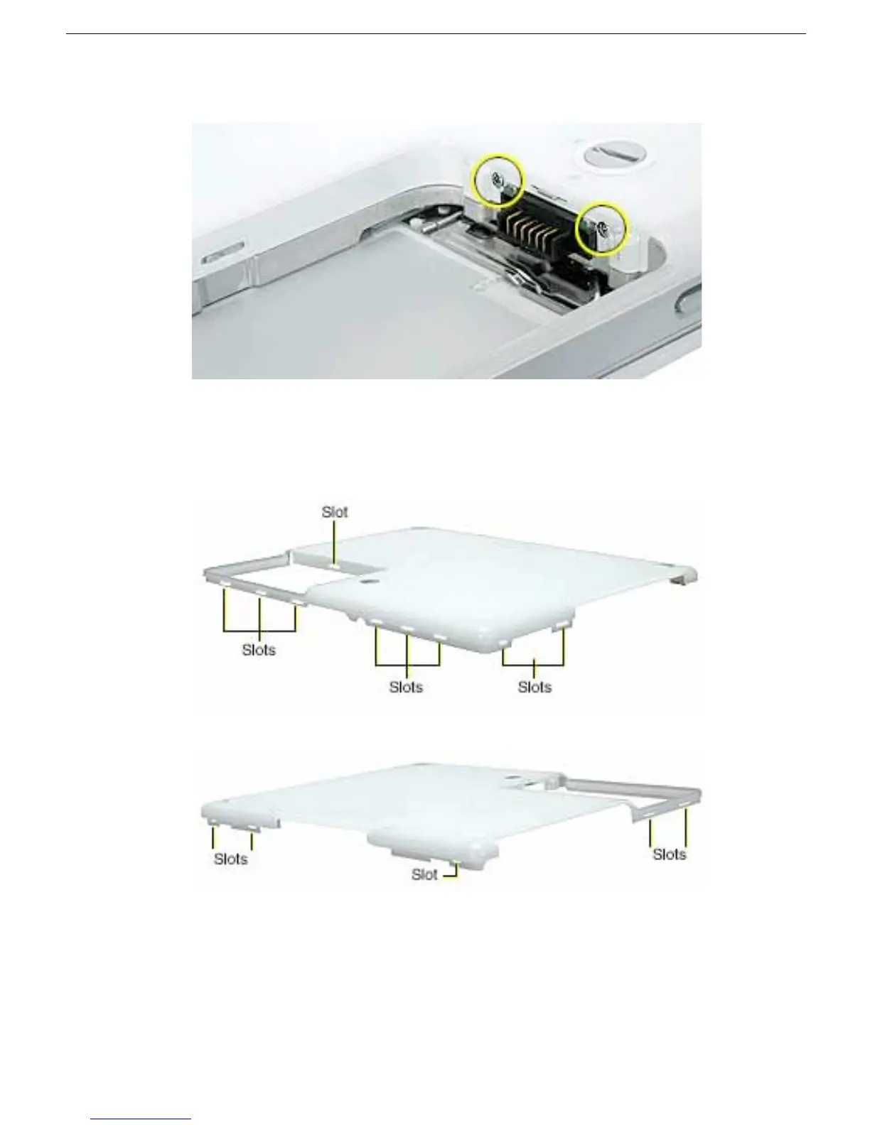 7. Note the locations of the slots on the bottom case. The computer frame has tabs that