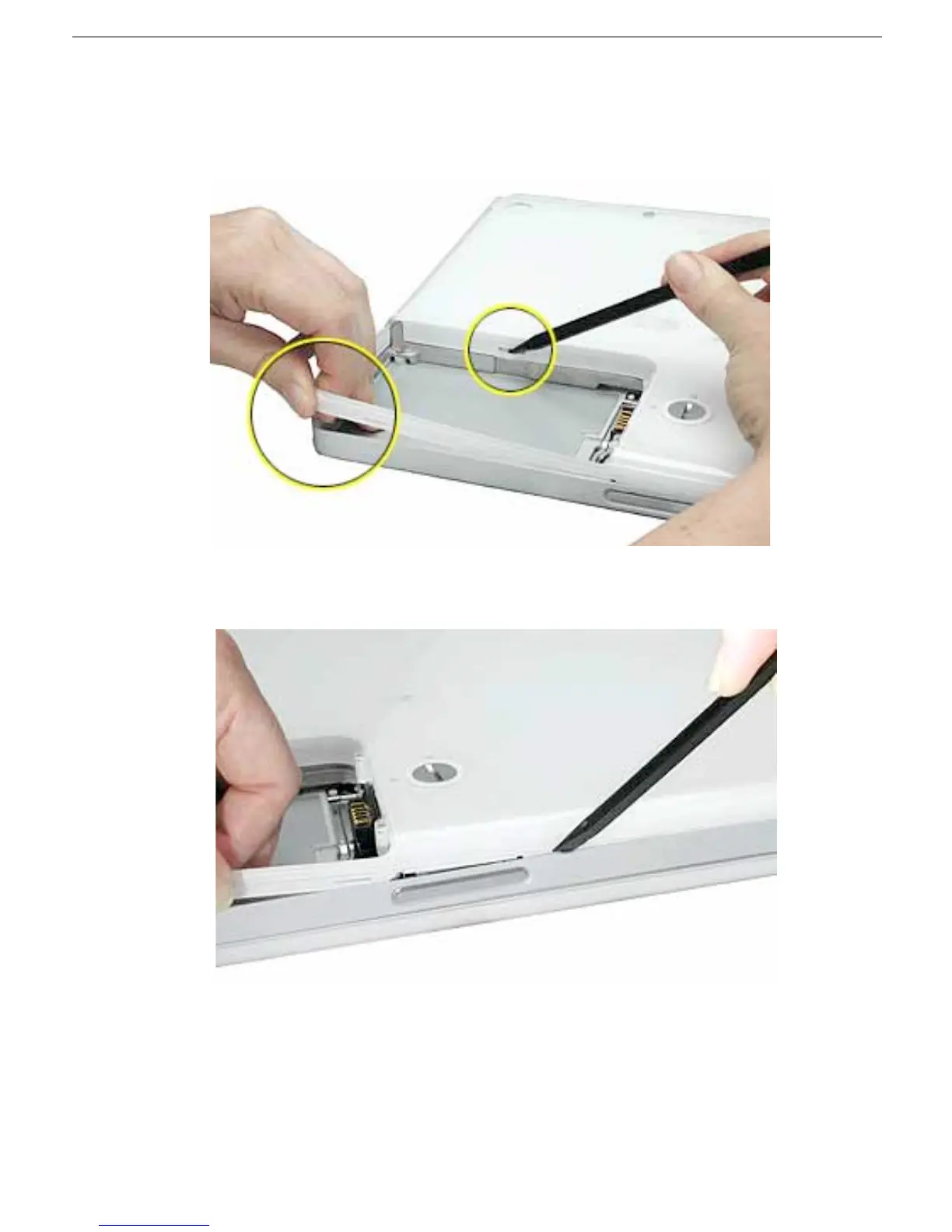 8. In the battery compartment, lift up the corner of the bottom case, and use a black stick
