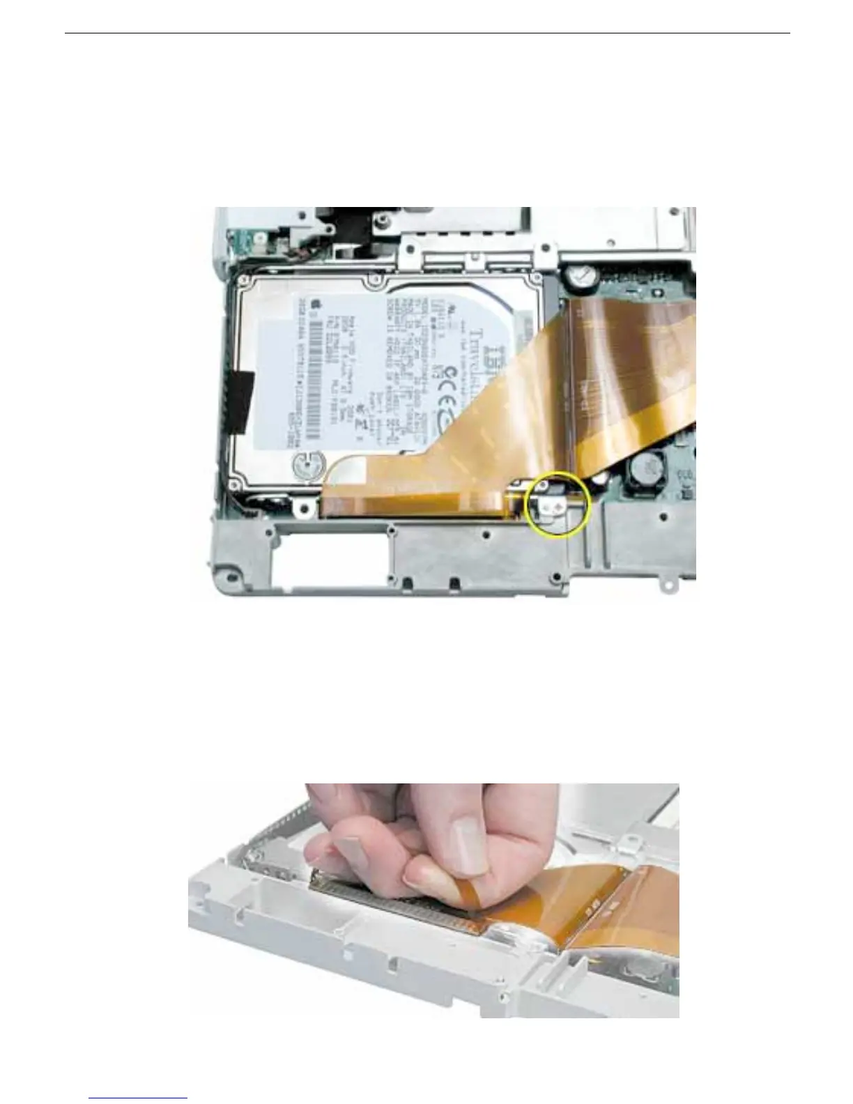 1. With the computer on a soft cloth, note the location of the hard drive and how the flex
