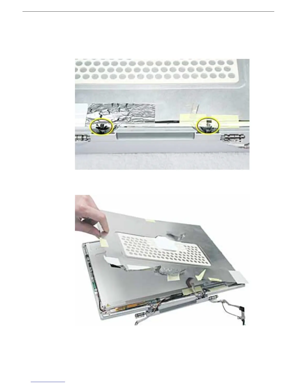 9. Peel up the tape that anchors the folded mesh strip of the LCD cable to the shield.
