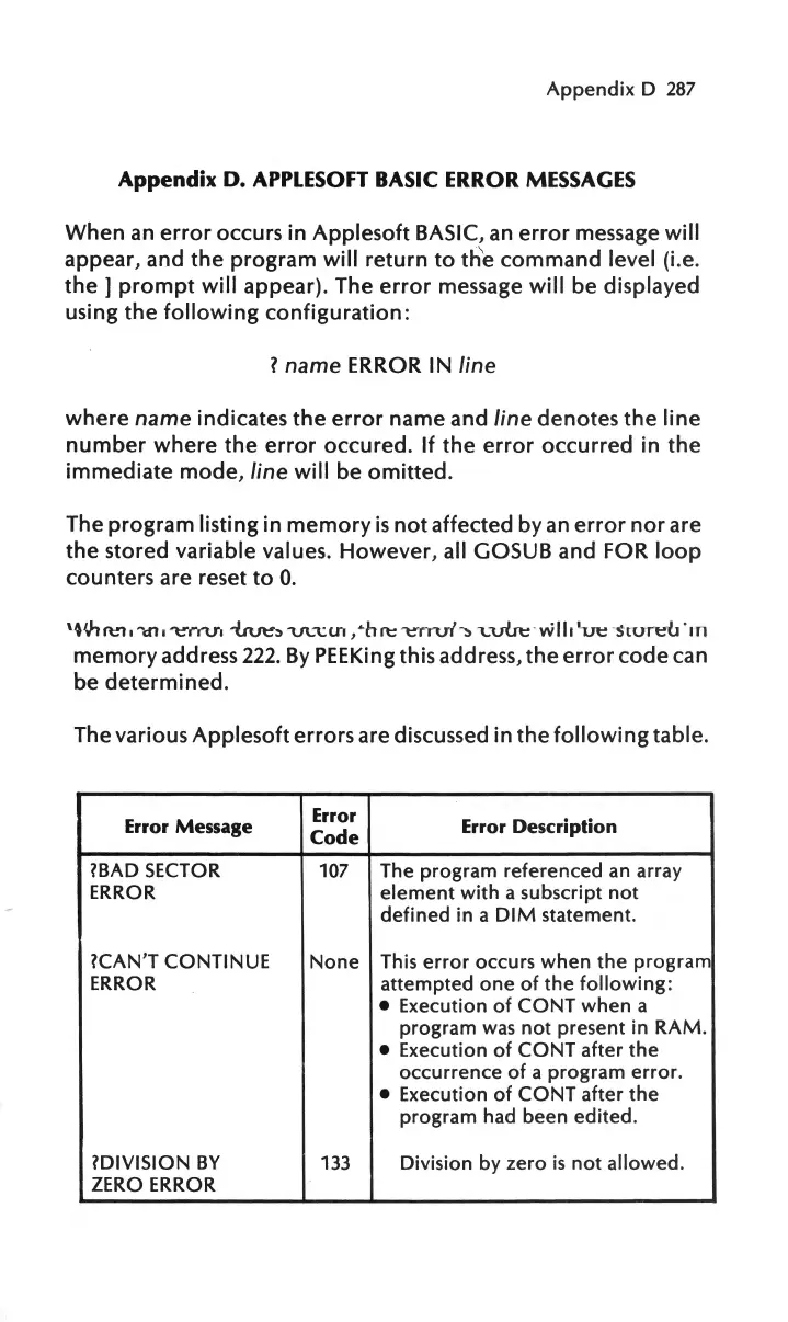 Apple IIe - Appendix D. Applesoft BASIC Error Messages
