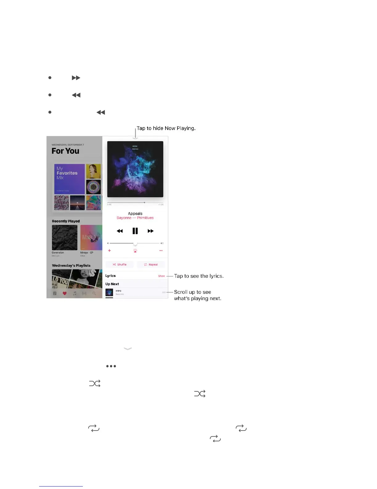 Repeat. Tap to repeat an album or playlist. Double-tap to repeat a single song. If