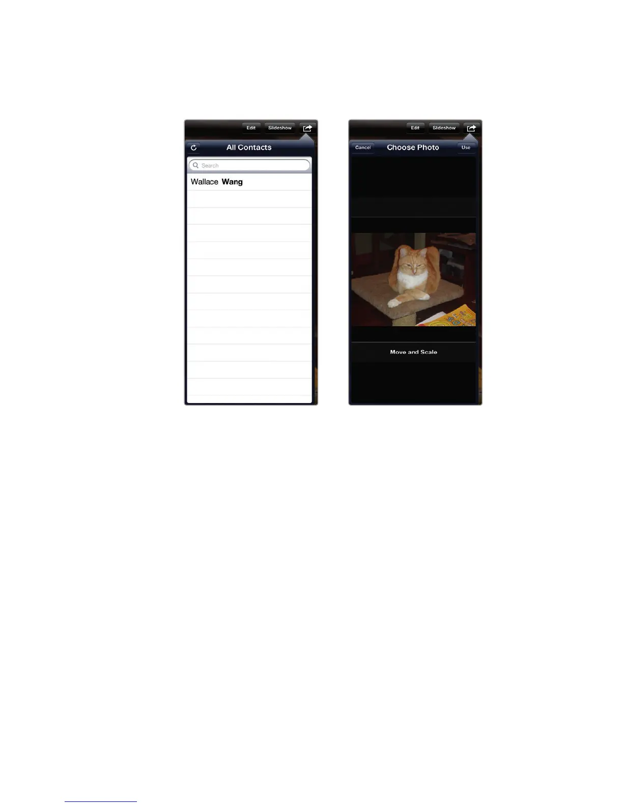 of the picture, tap Use. Now if you open the Contacts app and choose this