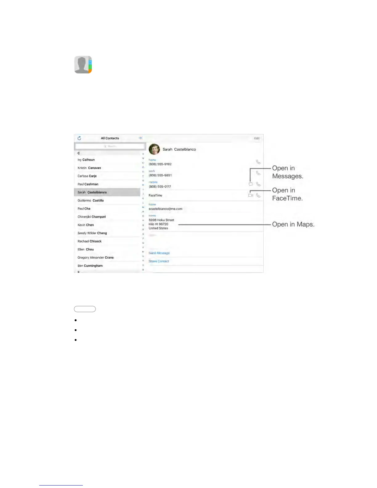 Tap a contact, then tap Share Contact. See Share from apps (on page) . Sharing