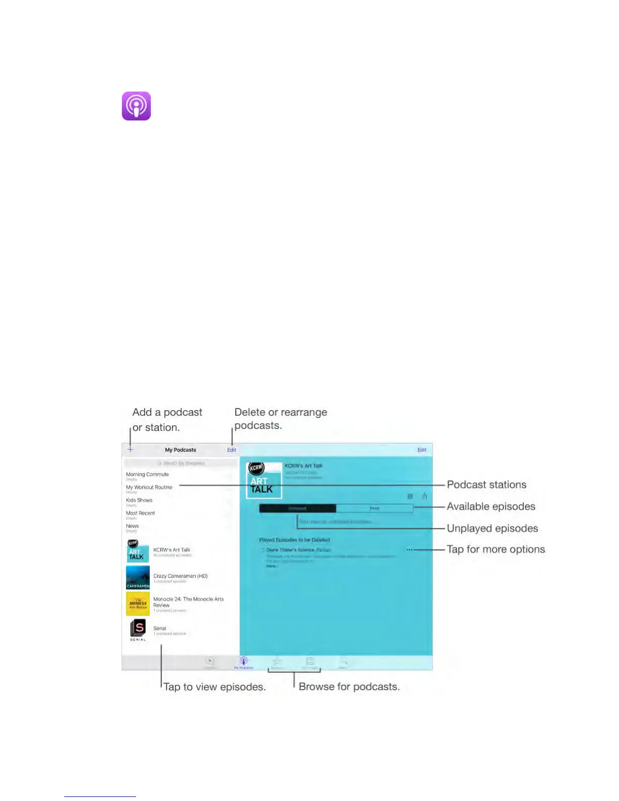 Open Podcasts, then browse, subscribe to, and play your favorite audio or video