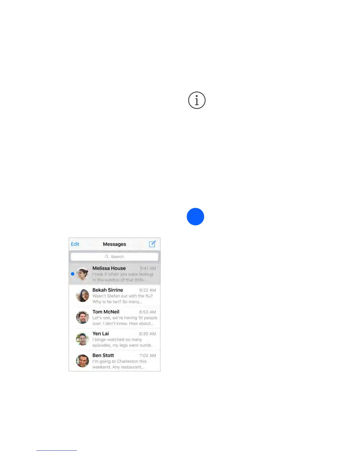 Conversations are saved in the Messages list. A blue dot indicates