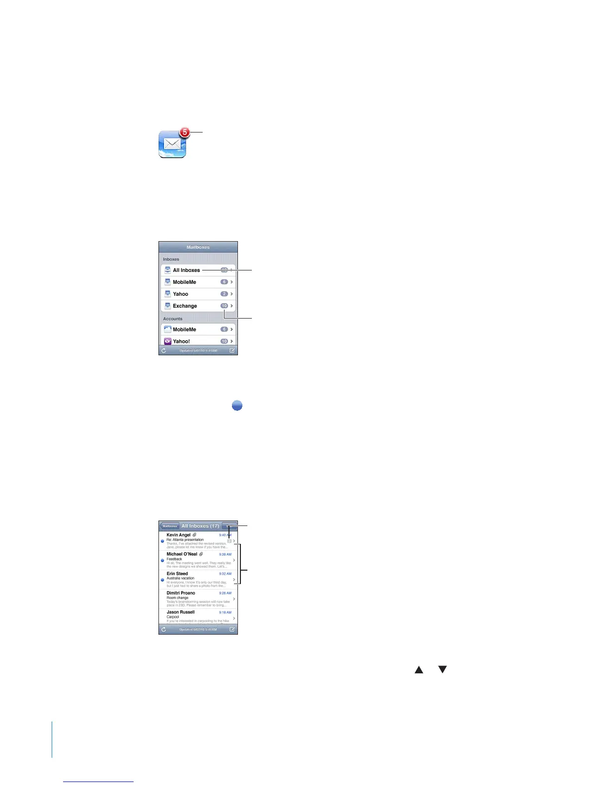 mailboxes. Tap an inbox to see the incoming messages for that account. To see