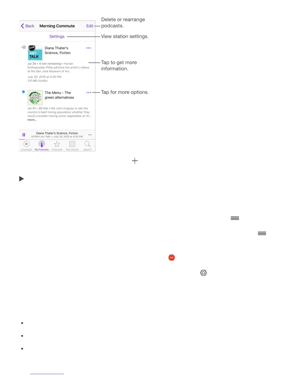 Delete stations. Tap My Podcasts, tap Edit, then tap .