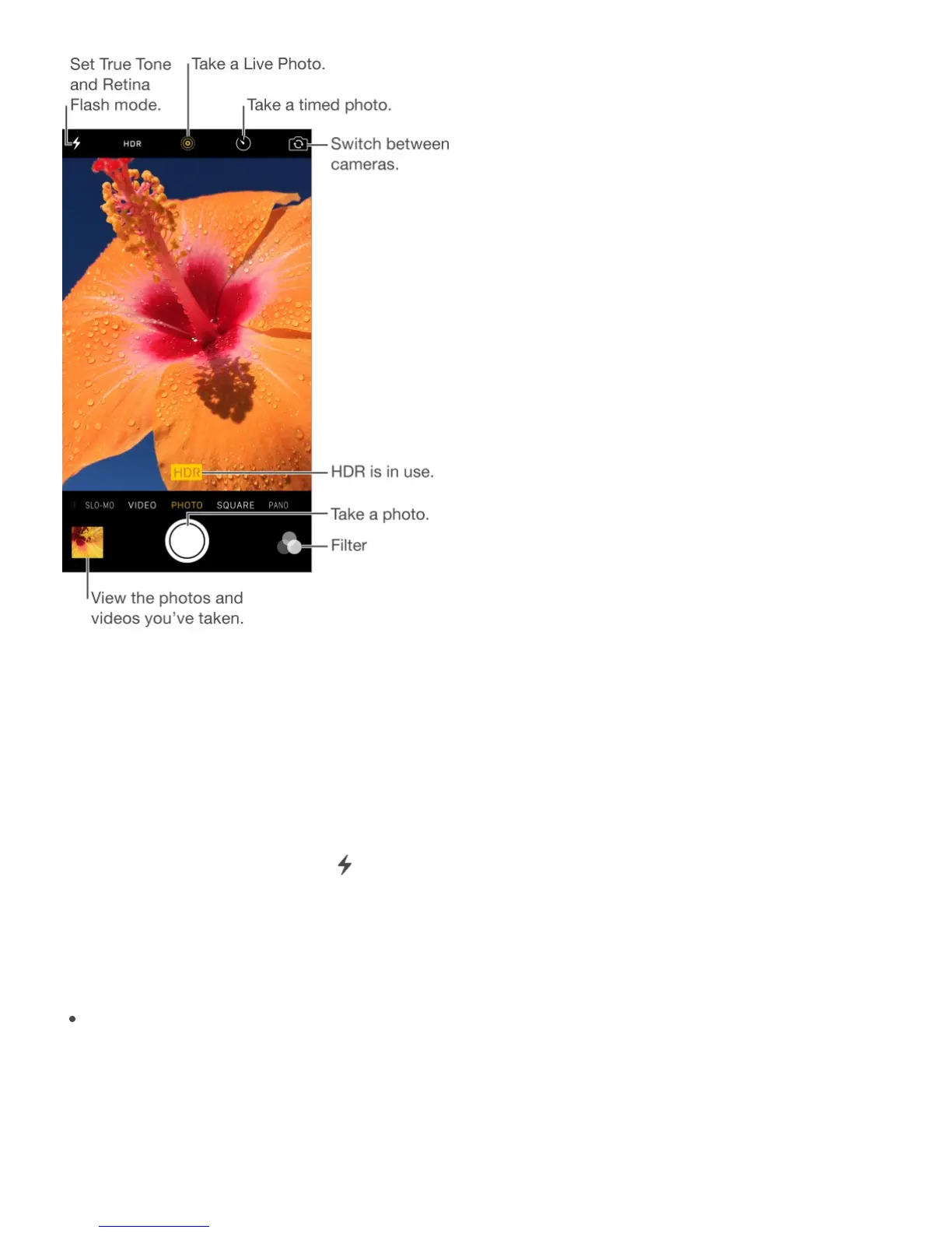 Turn the flash on or off. Tap . The True Tone flash on the back of iPhone also provides