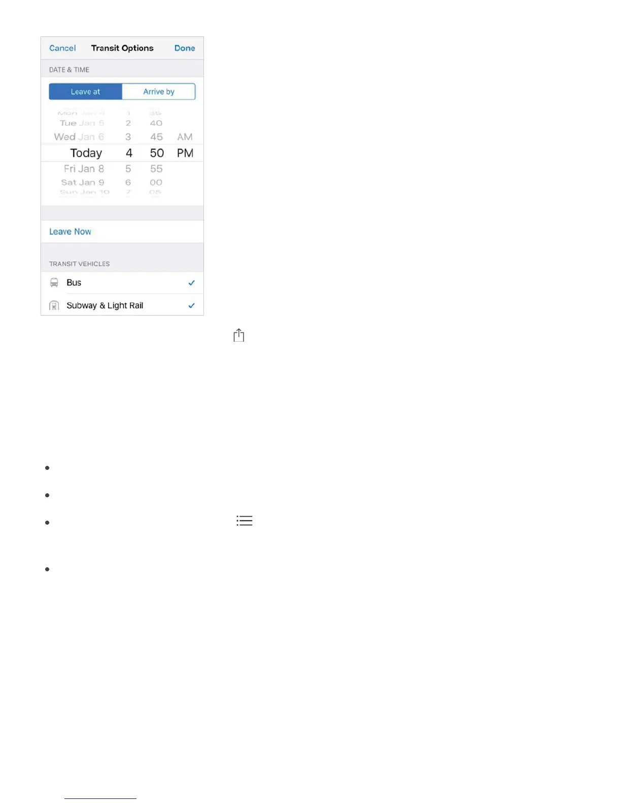 Share a route. Find a route, tap , then choose an option like Mail or AirDrop. See