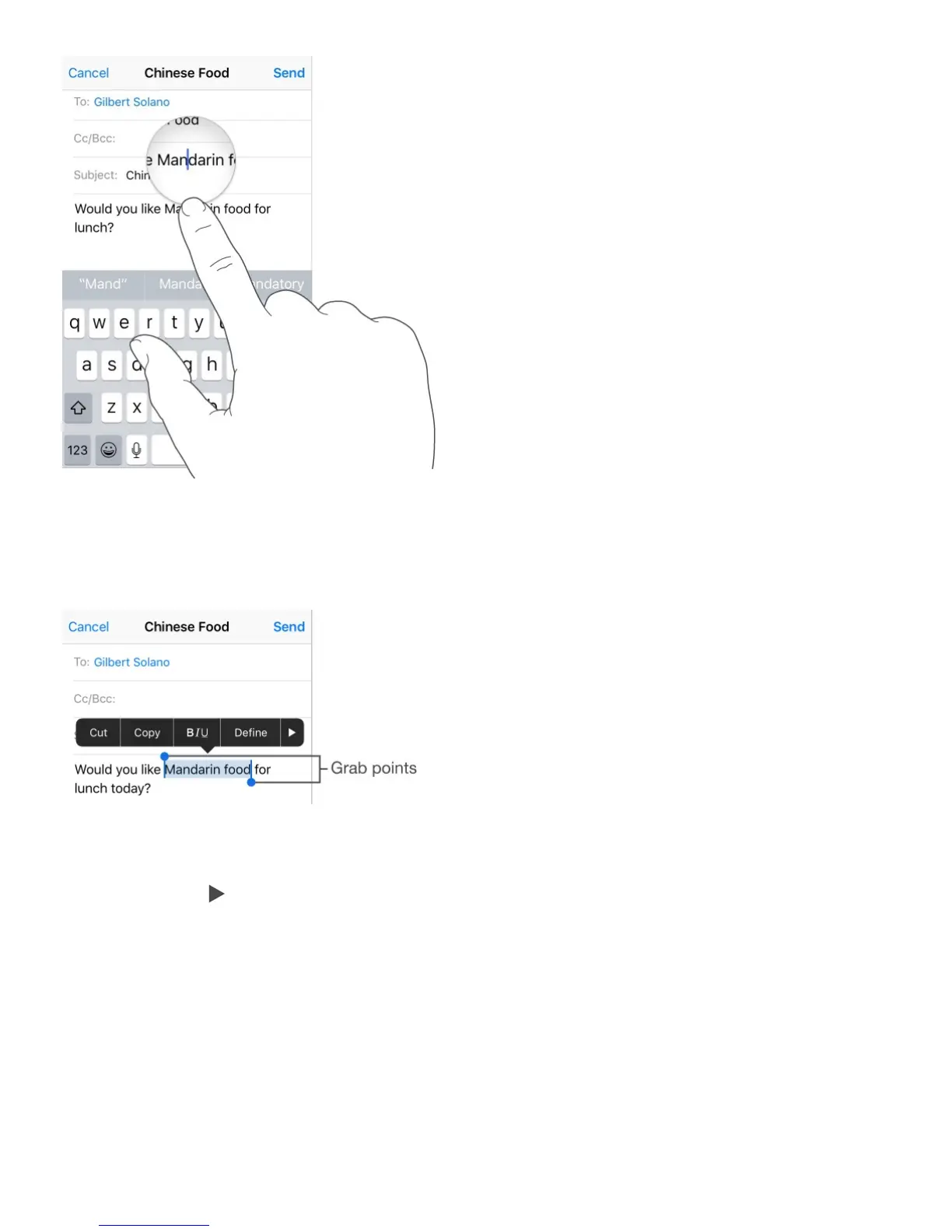 italic, or underlined text (tap B/I/U); get the definition of a word; or have iPhone suggest an