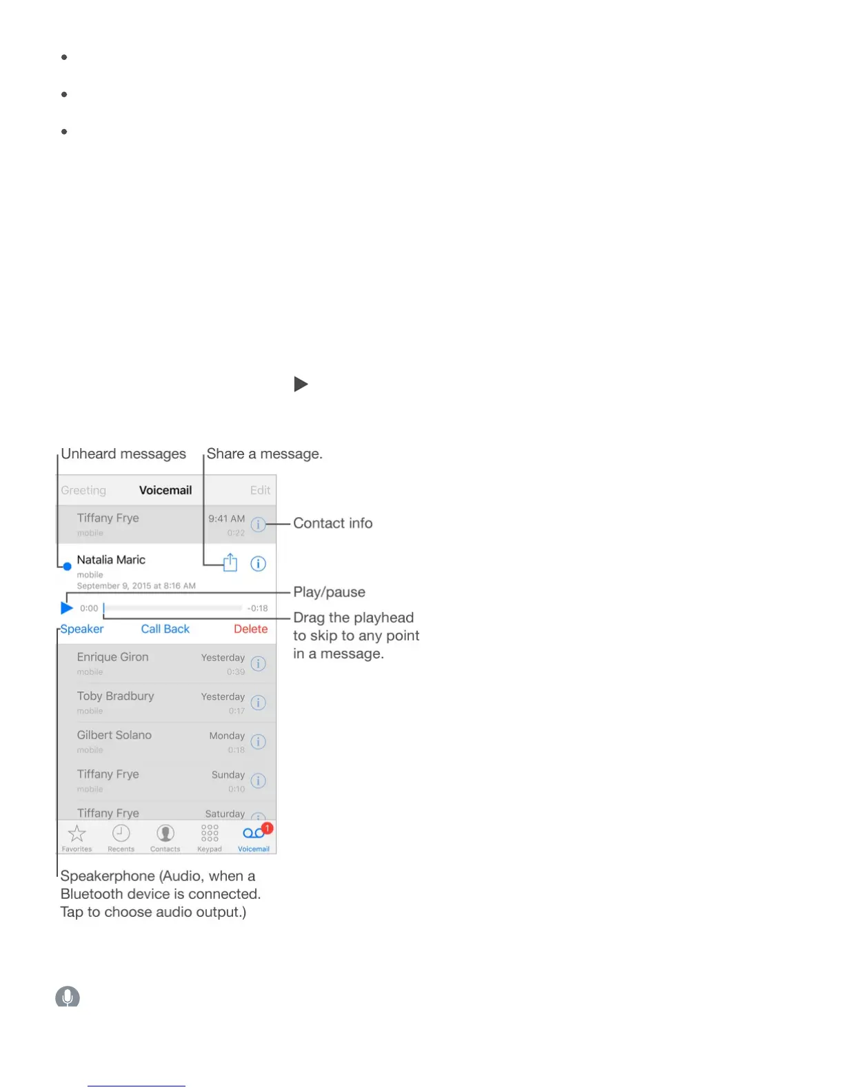 Listen to a voicemail message. Tap Voicemail, then select a message. To listen again,
