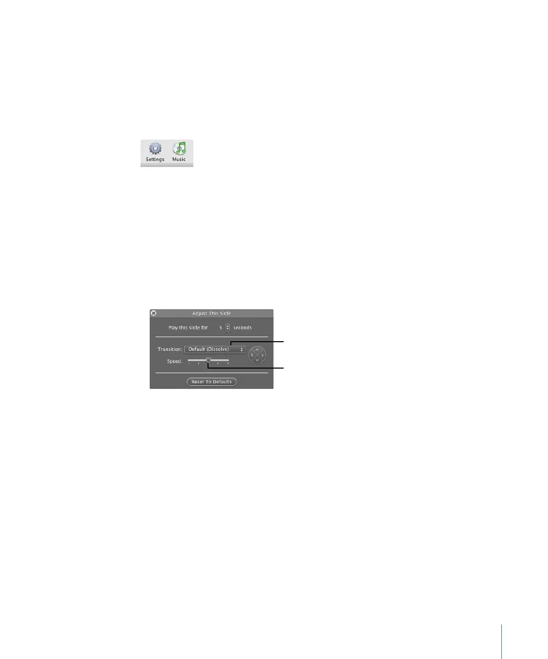 Speed slider. (You can also set other options for the entire slideshow in this dialog,