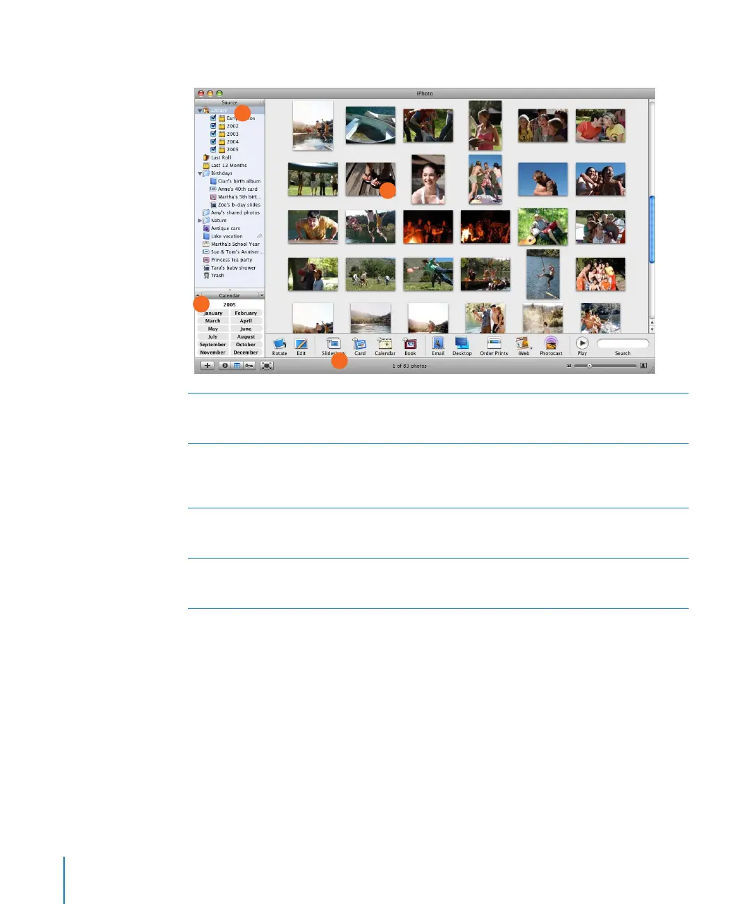 B Viewing area: View the photos in your library, albums, slideshows, and books. The iPhoto