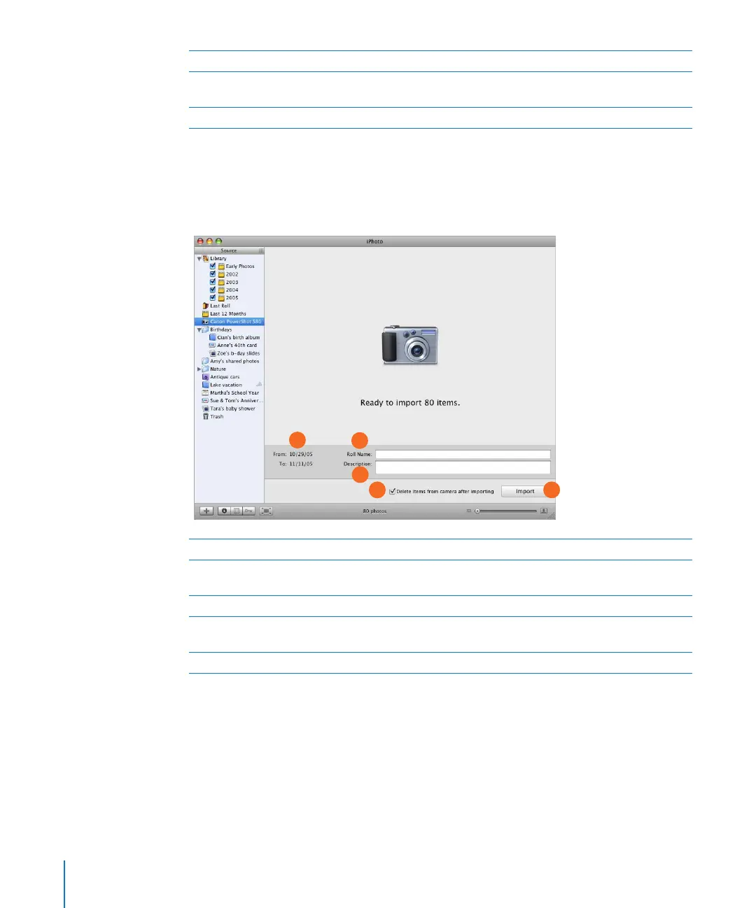 E Import button: Click to transfer photos from your camera to the iPhoto library.