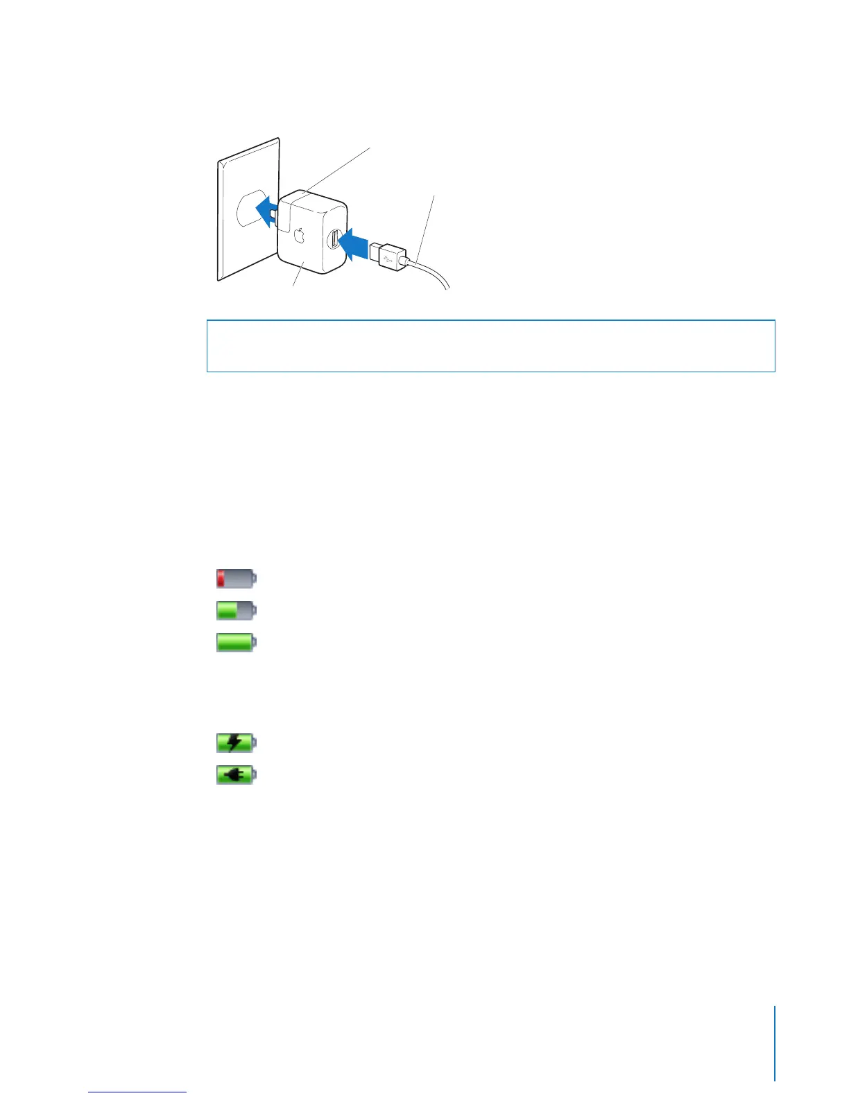 If iPod is connected to a power source, the battery icon changes to show that the