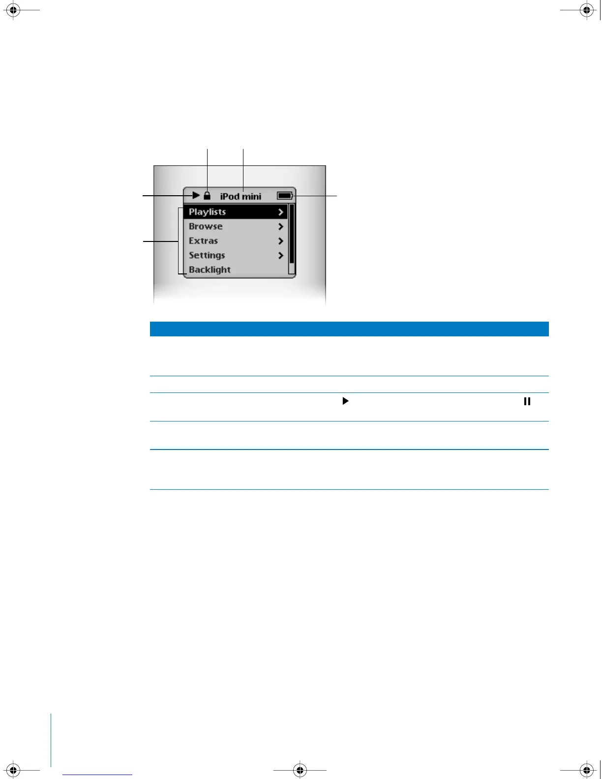 menus or perform functions on iPod mini. Status icons along the top of the screen