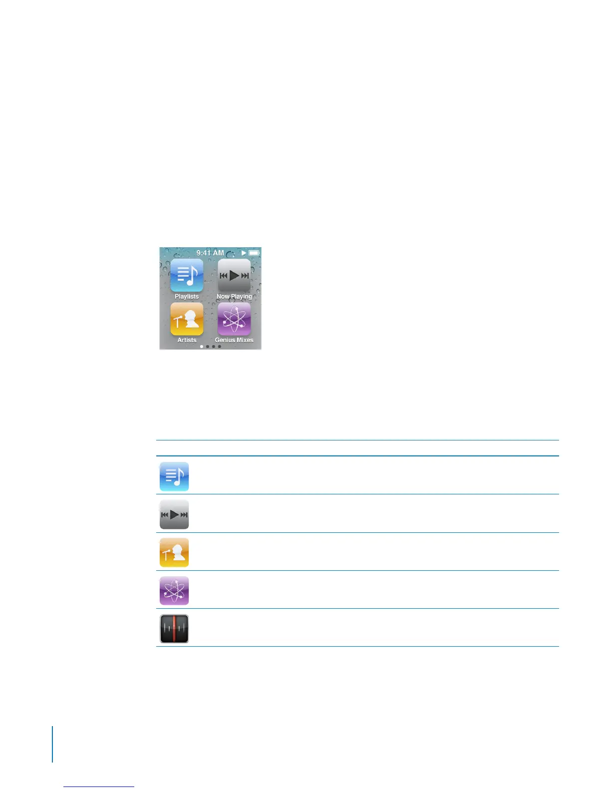 When you turn on iPod nano, you see the Home screen. The dots at the bottom of