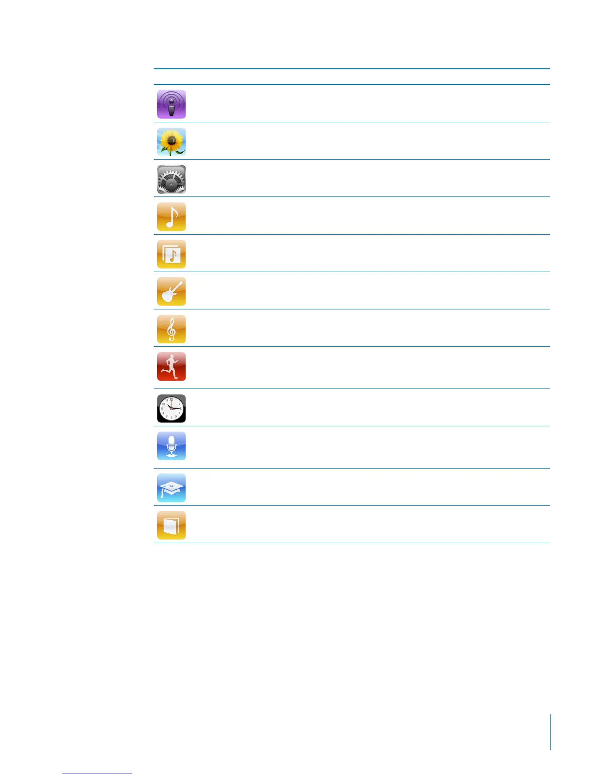 Songs Lists songs synced from your iTunes library, in alphabetical order.