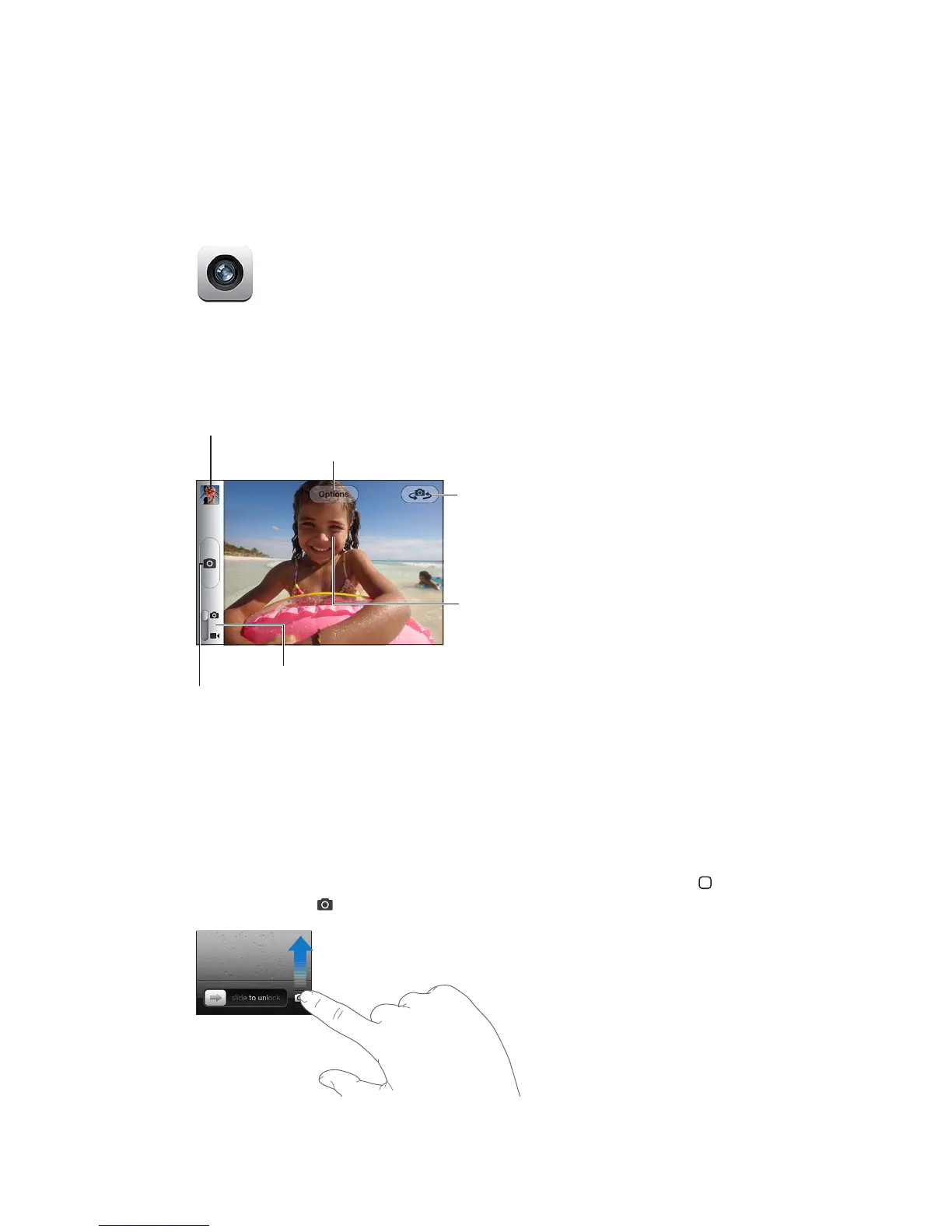 To quickly open Camera when iPod touch is locked, press the Home button or the On/O