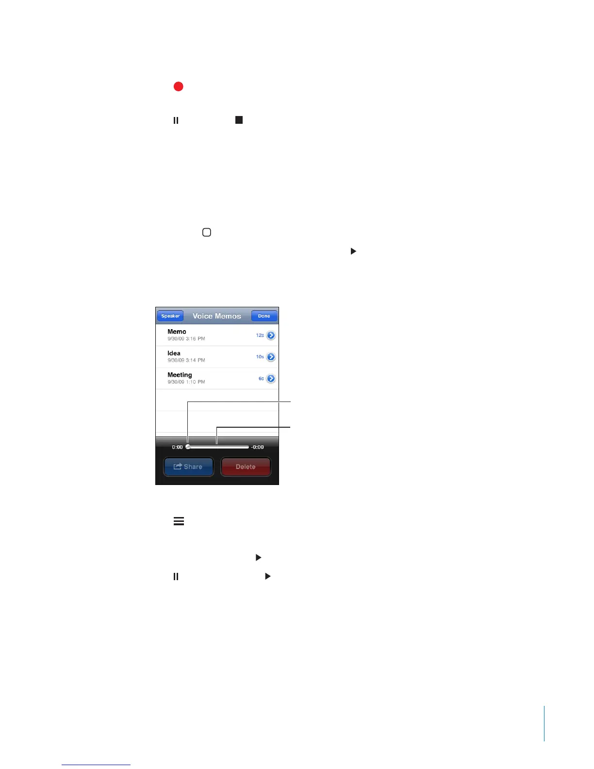 Delete a voice memo: Tap a memo in the list, then tap Delete.
