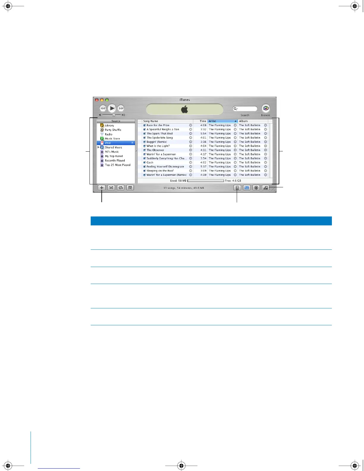 shows your library, playlists, CDs, iPod, the iTunes Music Store, and