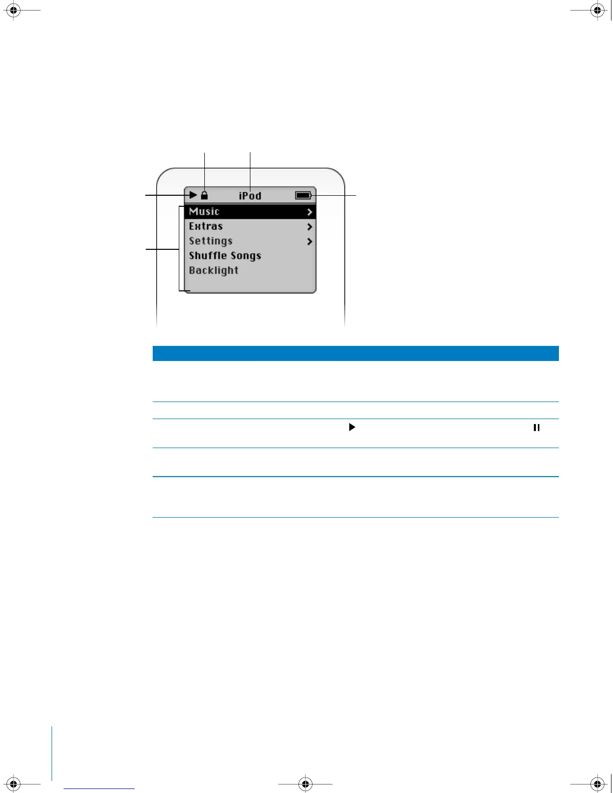 menus or perform functions on iPod. Status icons along the top of the screen show